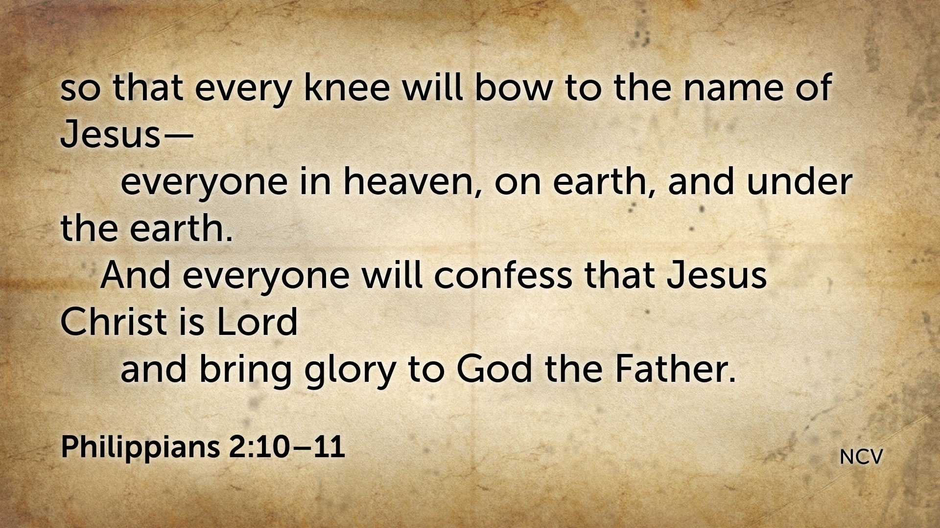 Philippians 2:10–11, The Message quoted also in Is 45:23; Rom 14:11
